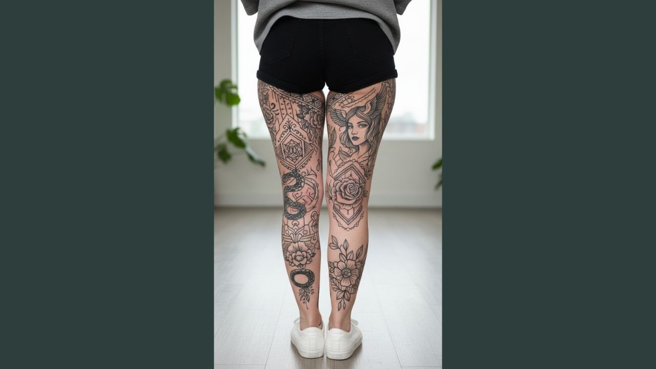 Dragons, geometric shapes, or tribal art flow from hip to ankle. Tattoos symbolize strength, courage, and individuality.